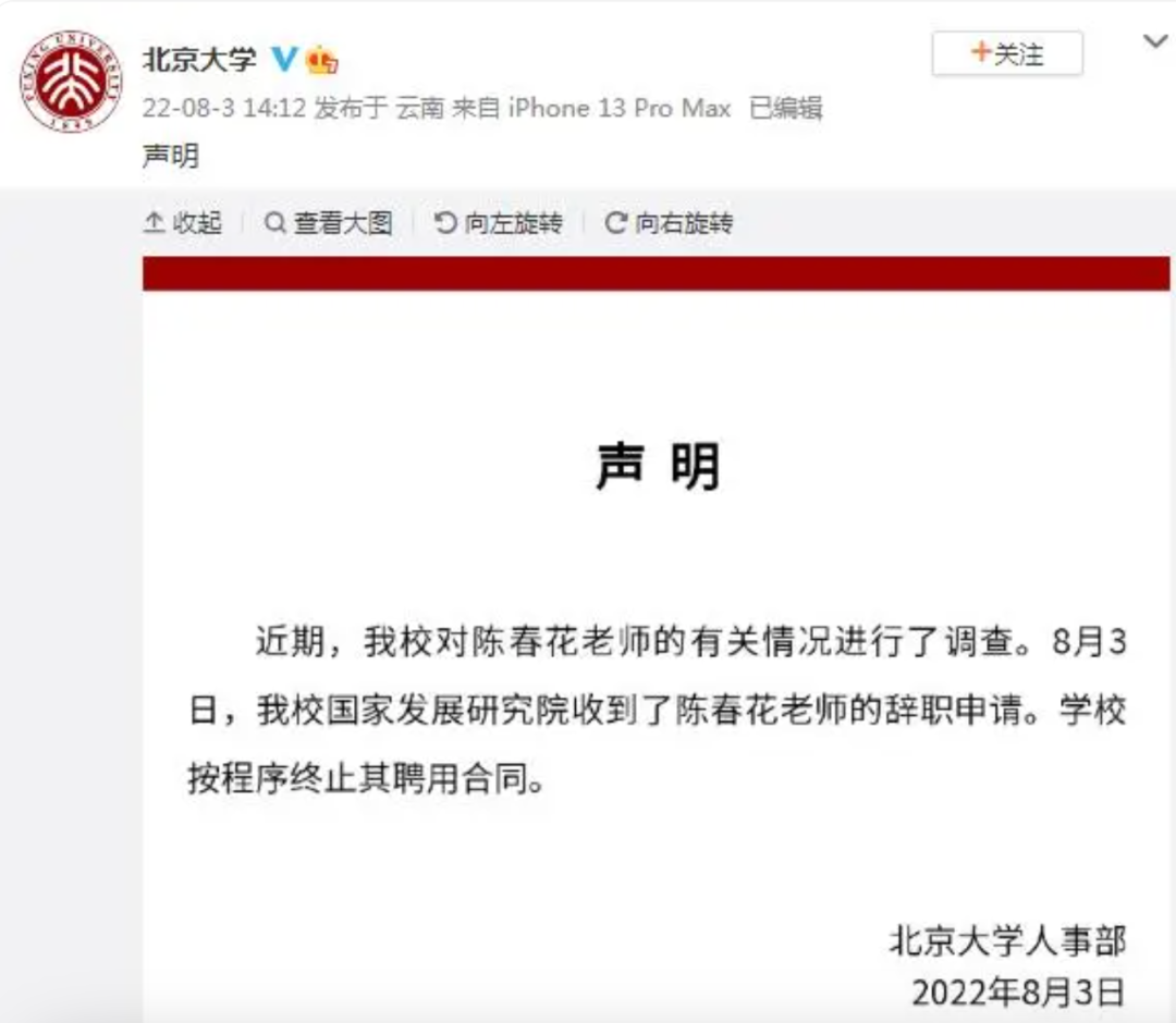 在2022年,华为就曾和北大知名学者陈春花“割席”。彼时网络上有多篇文章夸大、演绎陈春花对华为的解读、评论,华为于是发布声明称“华为与陈春花教授无任何关系,华为不了解她,她也不可能了解华为”。这篇声明一度使得陈春花陷入了学历舆论风波,社会声誉受到影响。