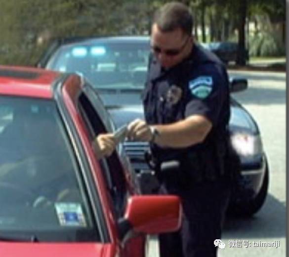 有三个警察一起下车,一个警察朝我走来,另外两个警察走向我的车尾和另一边的后座门口(事后听朋友说,这两个警察在检查我的后备箱,并看着坐在后座的她和女儿两人,仿佛随时准备预防她们逃走似的)。