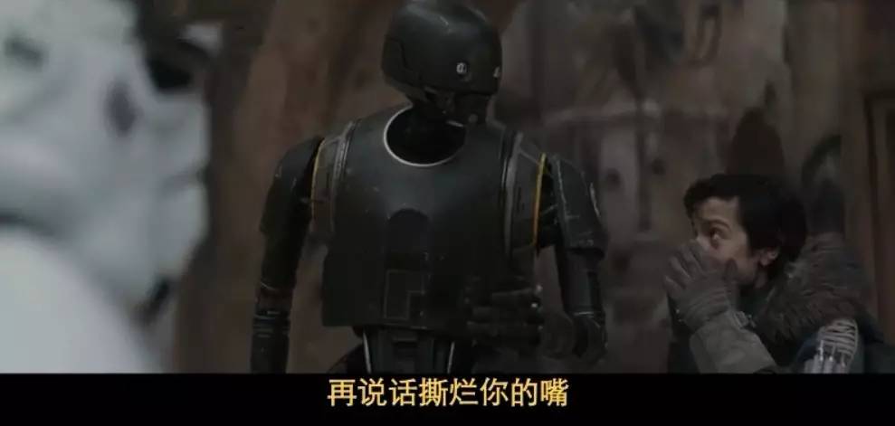 当琴·厄索和卡西安·安多被冲锋队包围时,K-2SO假装自己是抓住了男女主角的帝国机器人,甚至动手抽了主人一耳光,演戏做足全套,在电影院看电影的尖队和全场观众可耻的笑了。