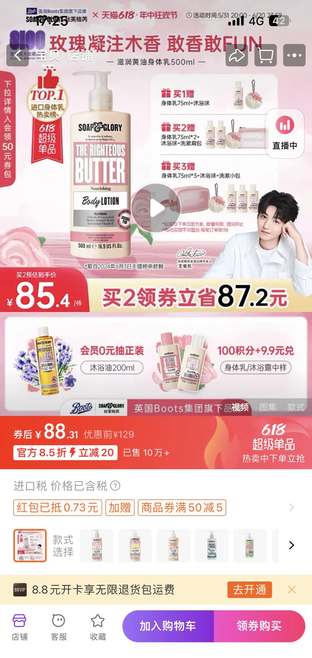 2018年9月20日,WBA与阿里巴巴达成战略合作,当天Boots在天猫国际开设的海外旗舰店也正式开业,这标志着Boots首次涉水中国市场。截至目前,该店内仅销售公司自有品牌Soap&Glory的个人护理产品,Soap&Glory旗下明星单品黄油身体乳显示已售出10万+件。