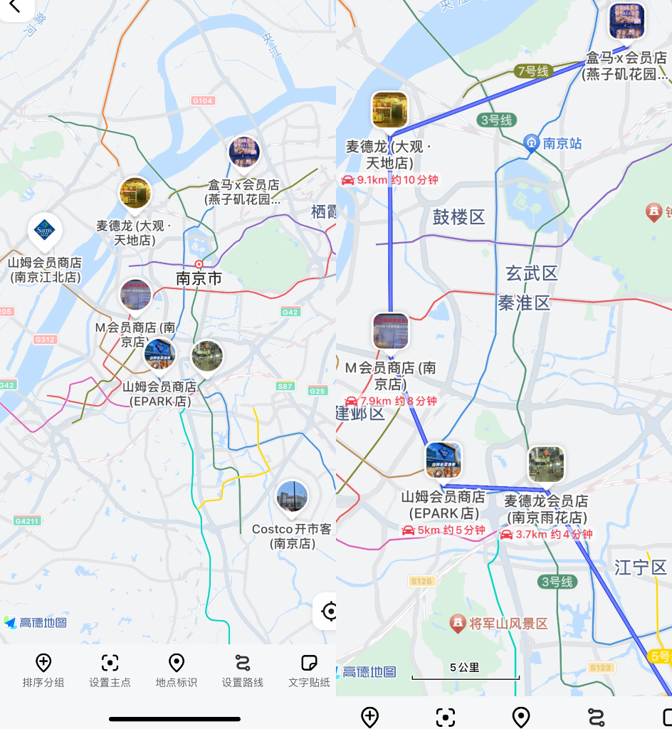 从位置上看,各个仓储会员超市遍布各个区,仅山姆会员商店(EPARK店)和麦德龙(雨花店)位于同一区内,且二者为强竞争关系——彼此距离不超过5公里,开车5分钟即可到达。