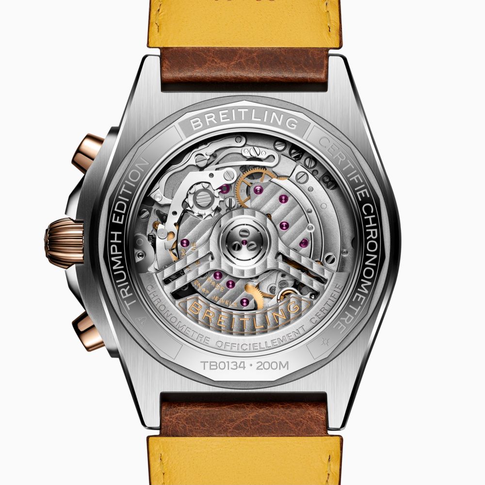 机械计时系列(Chronomat)最初于1983年为意大利“三色箭”特技飞行表演队(Frecce Tricolori)设计,一反当时的石英表热潮,使机械计时码表重现昔日辉煌。全新机械计时系列B01 腕表42 Triumph正是秉承了这种大胆创新精神,与凯旋在摩托行业中的先锋理念完美契合。