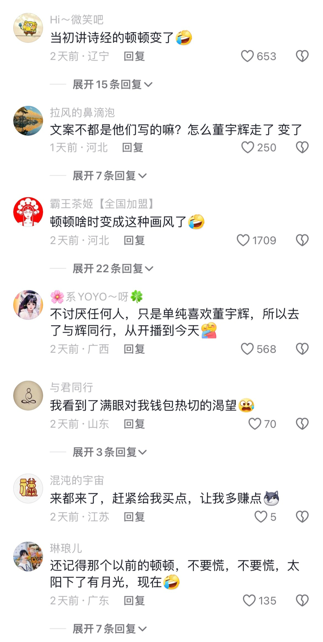 熟悉的配方加上魔性的节奏,真让人误以为走错了直播间。曾经的东方甄选可以讲诗经、说论语,充满诗情画意,如今变得与其他直播间无异,这让很多网友一时间难以接受。