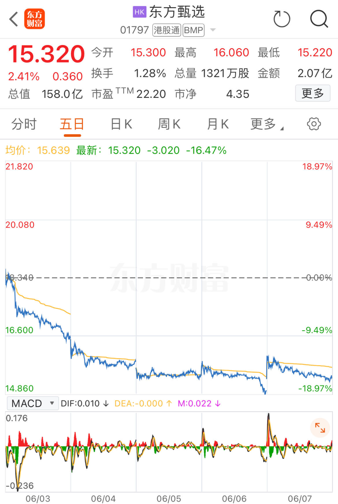 受此番言论影响,当天,港股市场涨声一片,东方甄选股价却高开低走,大跌9.92%。自5月31日至6月6日收盘,东方甄选股价在5个交易日累计跌幅超22%,且创下了2023年以来的最低位,市值蒸发了超43亿港元。