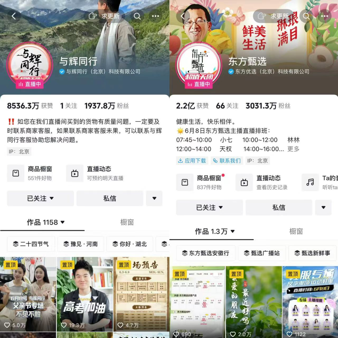 截至发稿前,东方甄选粉丝数为3031.3万,与辉同行粉丝数为1937.8万。