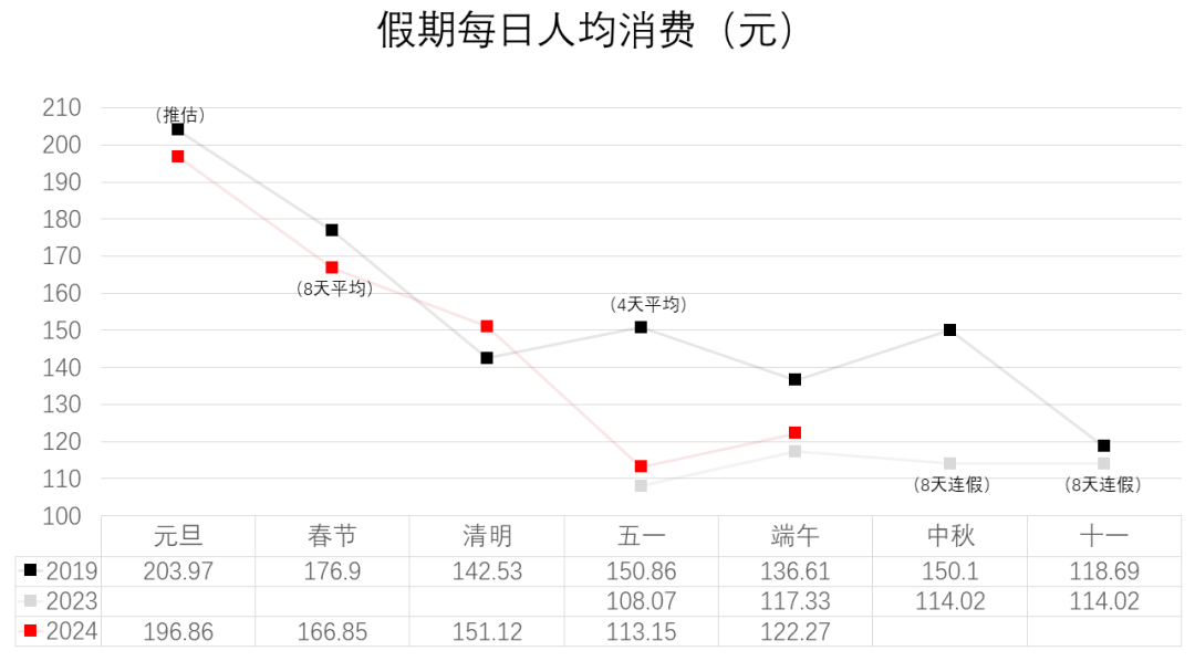 若均摊到每一天,可以看到,从去年五一至今,仅在清明节人均消费超过2019年同期水平。