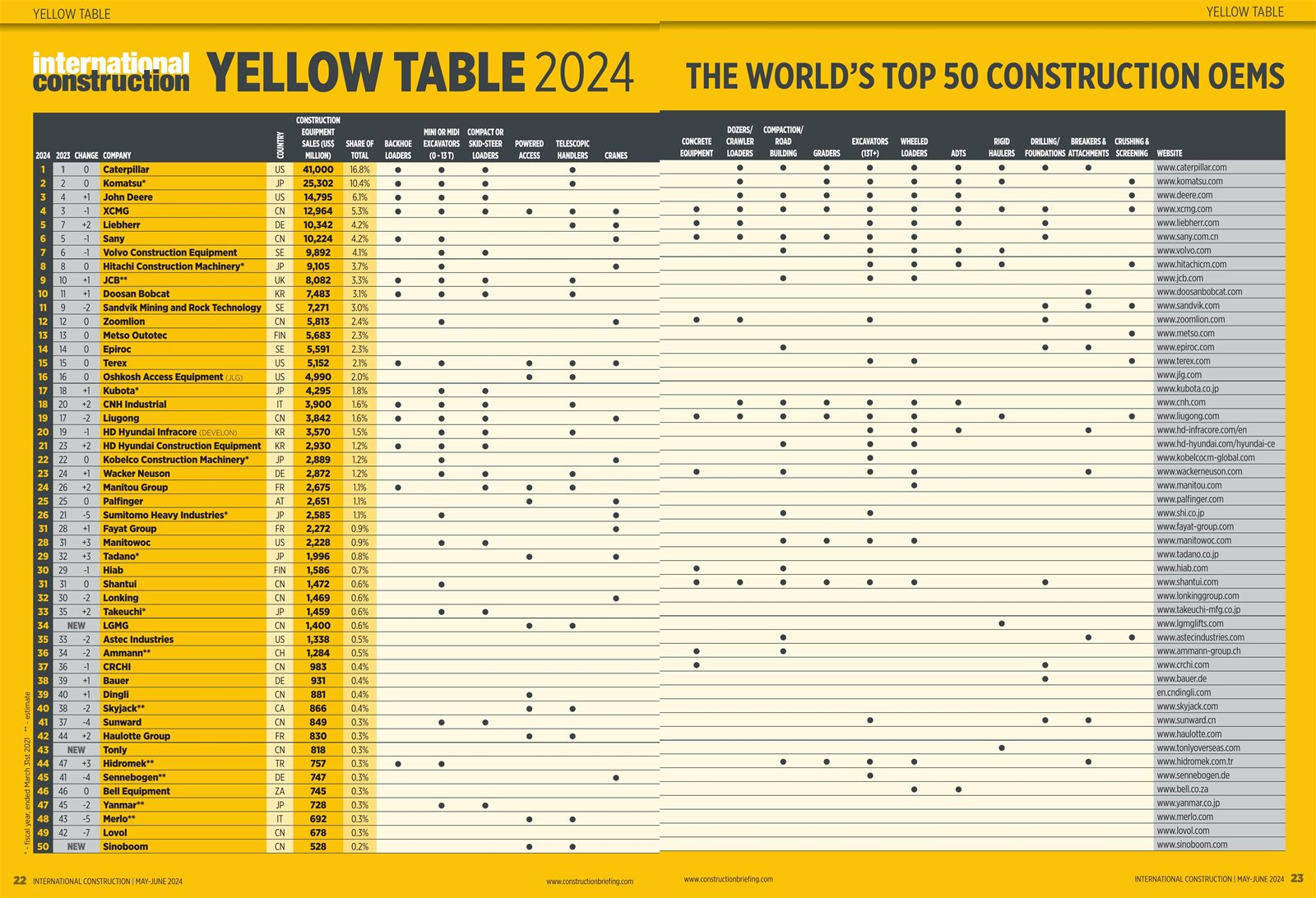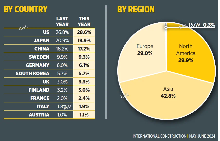 6月11日,全球工程机械资讯集团KHL旗下《国际建设》杂志发布2024年度全球工程机械制造商50强排行榜Yellow Table。
