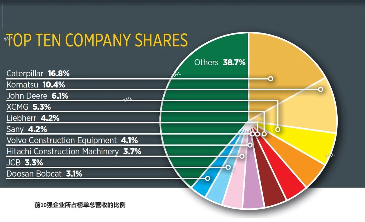 卡特彼勒销售额从上年的375亿美元上升到去年的410亿美元,所占榜单总营收的比例由16.3%扩大至今年的16.8%;小松的销售额有所提升,但其企业所占榜单总营收由去年的10.7%降低至10.4%。
