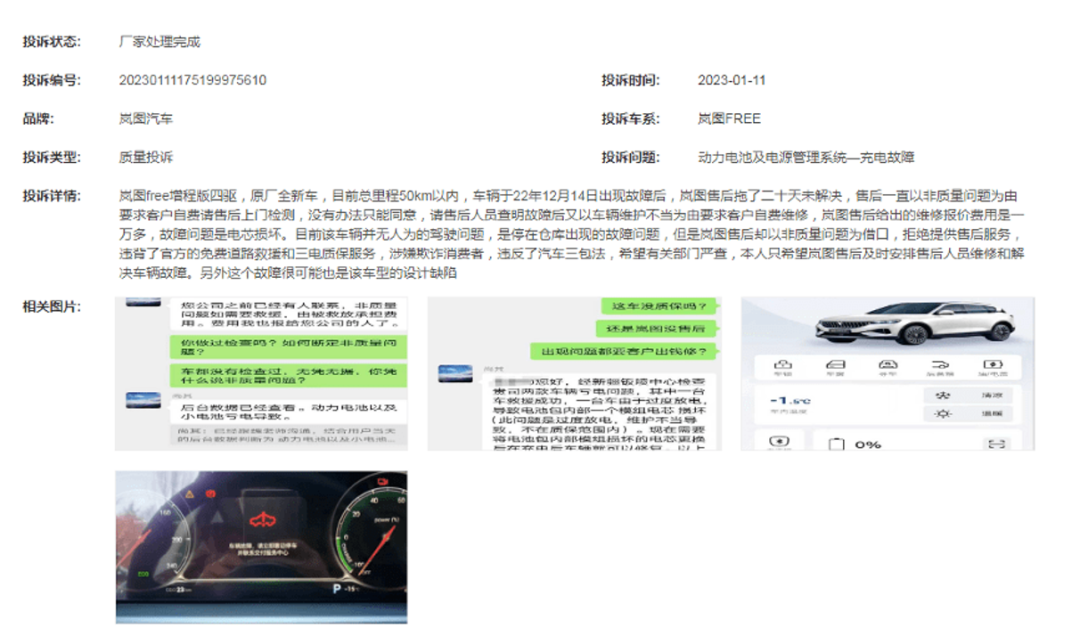 据中国汽车质量网显示,2023年1月11日,一位消费者投诉称,自己购买的岚图汽车于22年12月14日出现故障后,岚图售后拖了20天仍未解决,售后一直以非质量问题为由要求客户自费请售后上门检测。