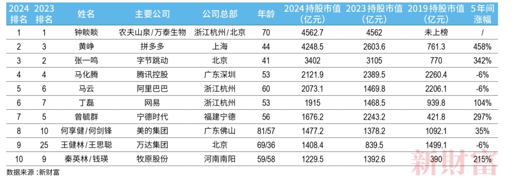 同为80后的黄峥、张一鸣分列榜眼、探花,持股市值则从5年前的700亿元量级,分别跃至4248亿元、3402亿元。马化腾、马云、丁磊、曾毓群、何享健、秦英林等人稳居创富榜前十。王健林先后出让了万达电影、珠海万达商管的控制权,但仍掌握着大连万达商管集团46%股权,后者2023年正常发债,以其中披露的数据计算,王健林父子总身家达1406亿元,回到前十。