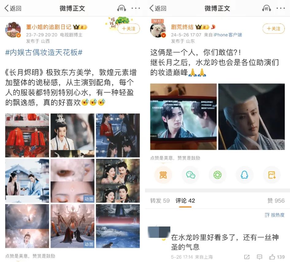 其中最为观众熟悉的是负责古装的獭獭文化。该厂牌的上位之路相当清晰,通过耽改种子选手《皓衣行》一举进入大众视野,耽改殉掉之后继续绑定罗云熙,拍摄了仙侠剧《长月烬明》与玄幻武侠《水龙吟》,是古偶妆造营销的开辟者之一。