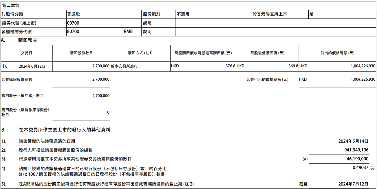 腾讯控股6月12日在港交所公告,今日斥资10.04亿港元购回270万股公司股份,回购区间369.8港元/股-376.8港元/股。