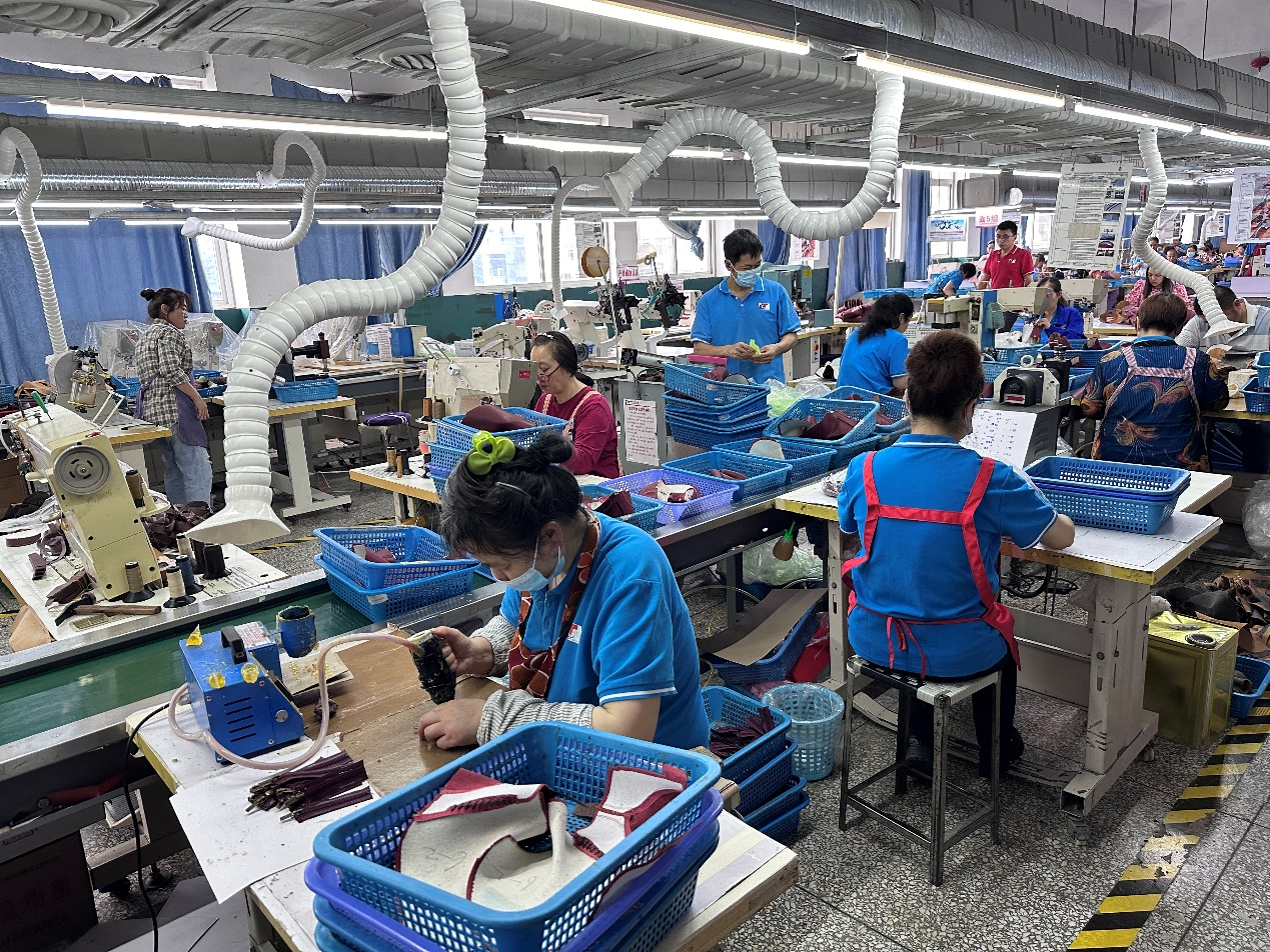 在轰鸣的生产车间,成都雷泰鞋业有限公司的制鞋工人们正在有序地开展各自的工作,整个车间一派繁忙景象。