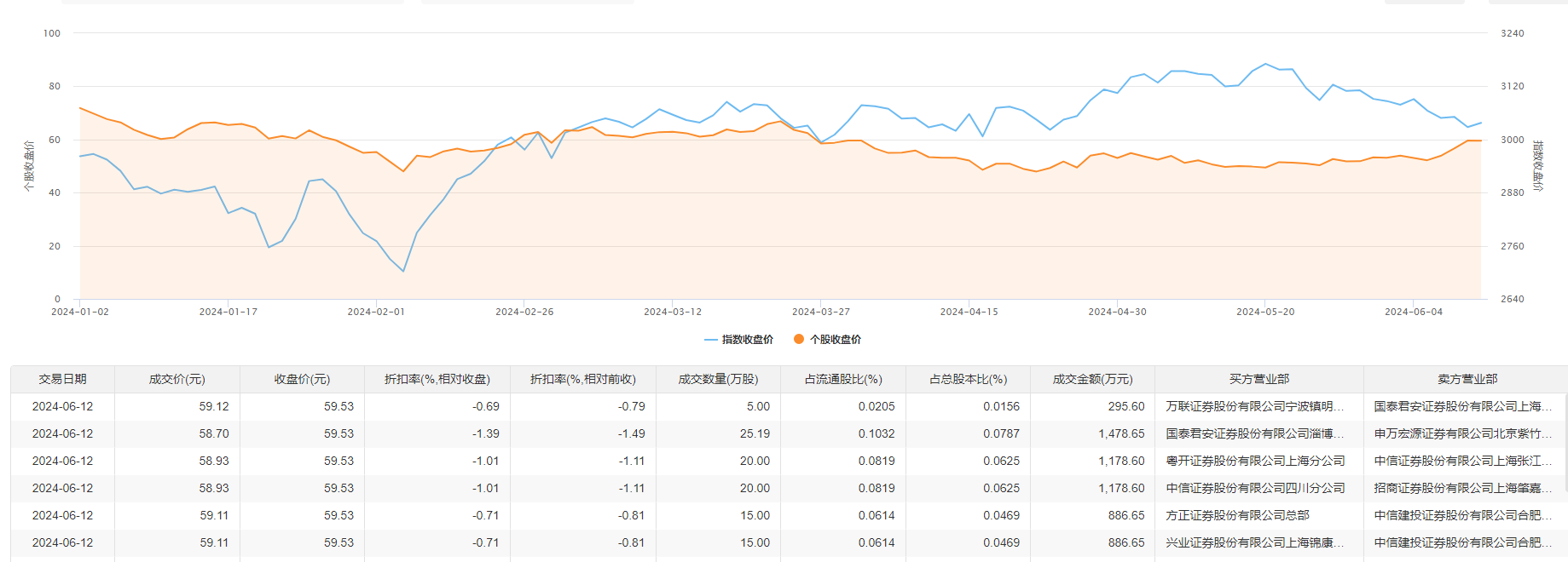 中科飞测6月12日大宗交易成交100.19万股,成交额5904.75万元,占当日总成交额的11.98%,成交均价58.94元,较市场收盘价59.53元折价0.99%,其中最高成交价59.12元,最低成交价58.7元。