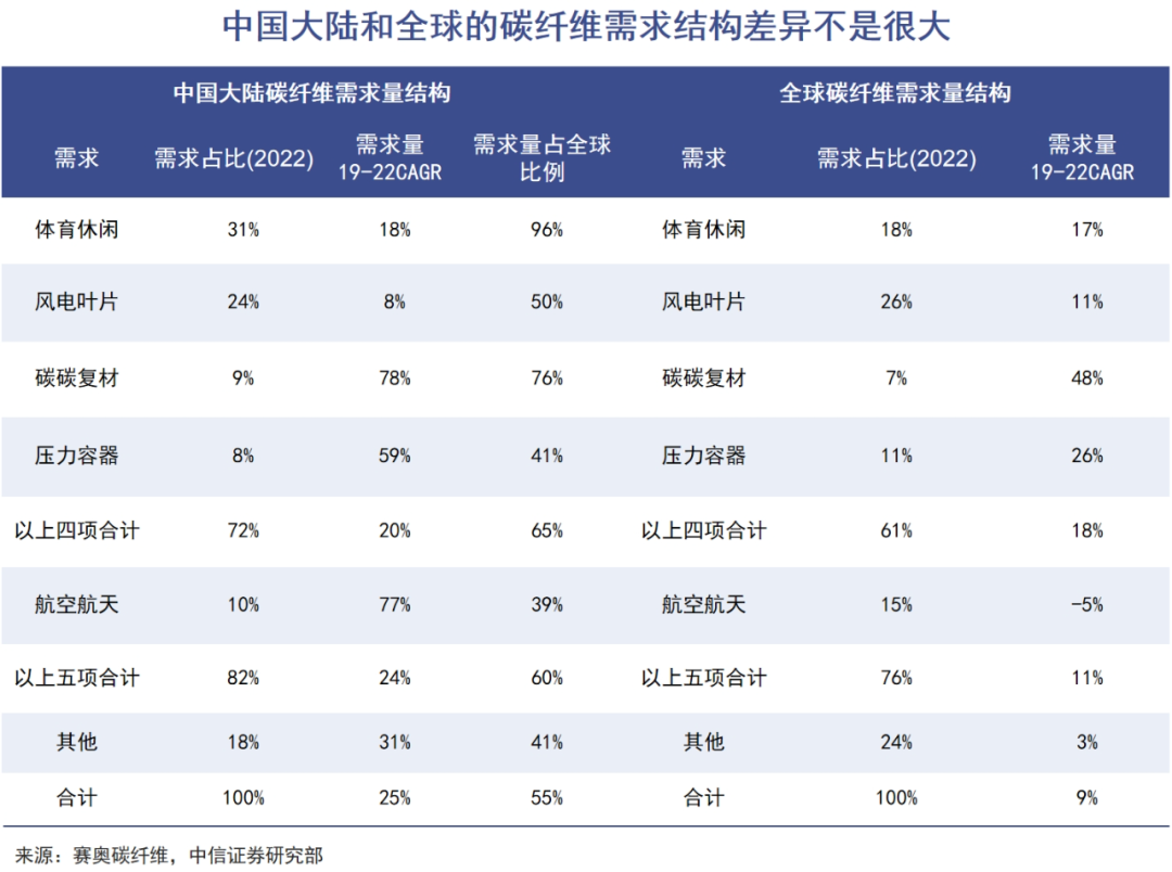 从需求端来看,目前中国与全球的碳纤维需求结构差异不是很大,在风电叶片、碳碳复材、压力容器、航空航天等其余产业中的应用,中国与全球需求占比基本保持一致。另外,在高尔夫等体育场景的应用,中国相比海外市场占比显要高很多。