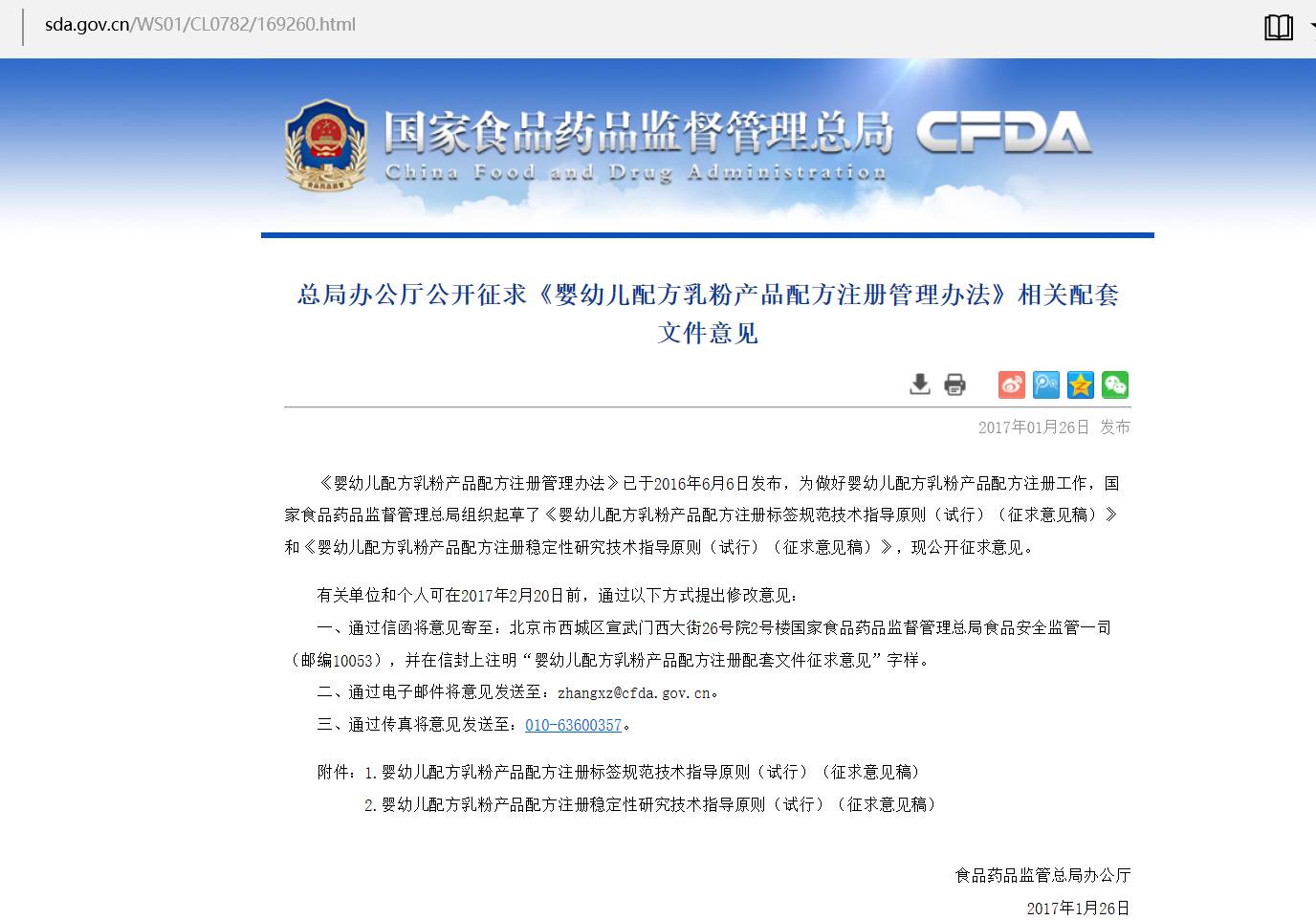 为此,2017年1月26日,国家食药监总局在官网上发布消息,即国家食药监总局办公厅公开征求《婴幼儿配方乳粉产品配方注册管理办法》相关配套文件意见。