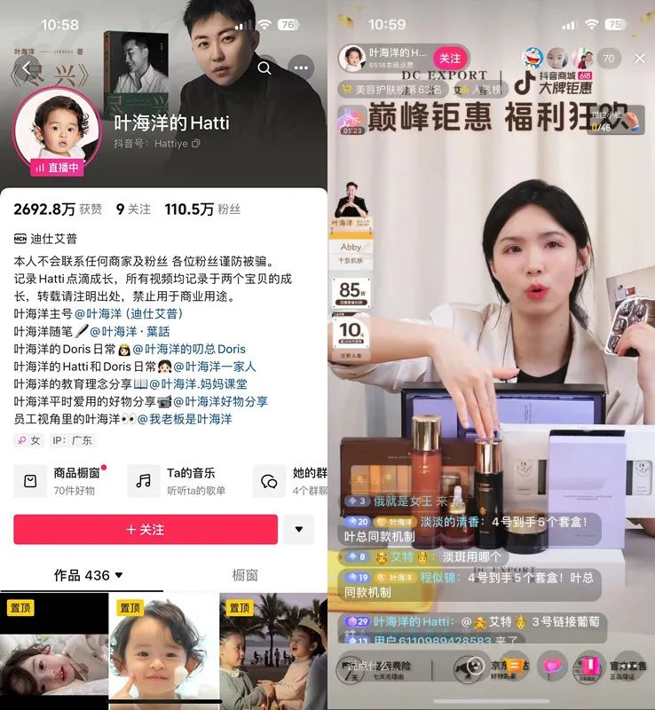 从销售组成上看,DCEXPORT同样高依赖于其创始人叶海洋的个人IP,但与普通白牌美妆依靠单一创始人下场直播不同,叶海洋在主号之余还开设了7个矩阵账号,其中包含两个萌娃账号、一个家族账号、一个随笔账号、一个好物分享账号、一个教育理念账号和一个员工眼中的老板账号。