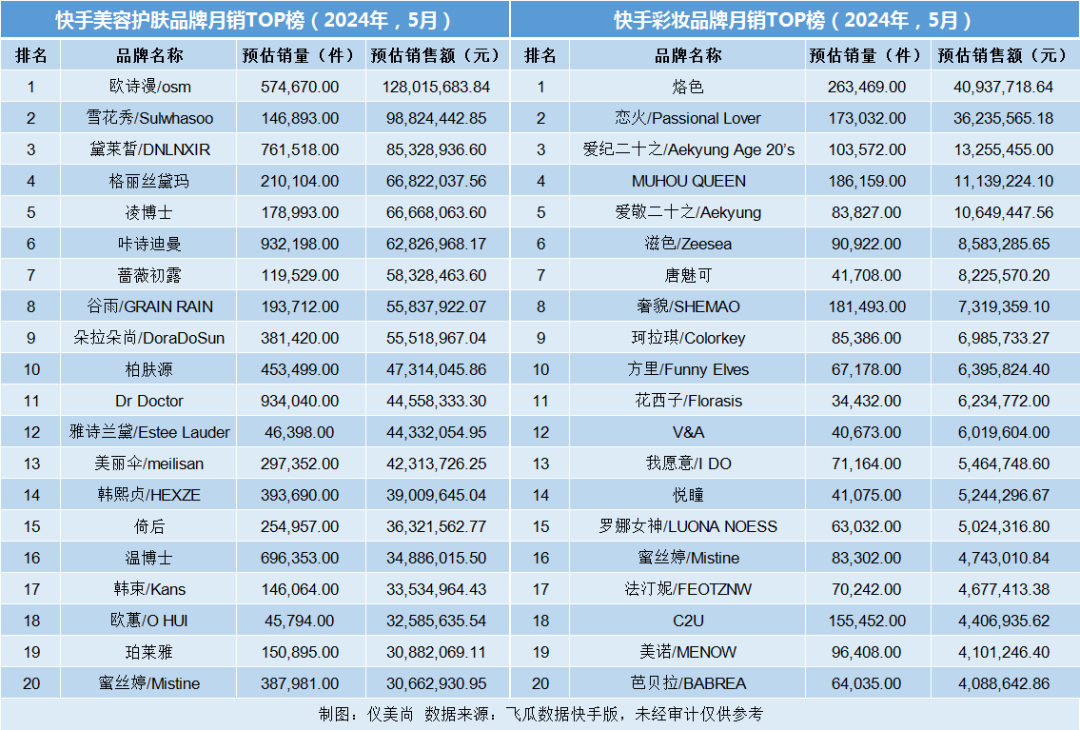 从榜单排名看,5月快手护肤和彩妆类目前20的品牌中,成熟品牌分别占到12和10个,其中雪花秀、雅诗兰黛等国际大牌也再次回归。且值得欣喜的是,5月位居护肤类目榜首的欧诗漫,预估销售额为1.28亿元,这是今年起快手平台上首次出现的月销过亿的品牌,也是欧诗漫今年首次斩获快手类目第一。