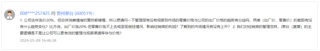 如5月9日,有投资者在全景网投资互动平台提问:2023年贵州茅台涨价20%,但总体消费情绪的复苏都缓慢,所以想请问一下管理层有没有观察到市场的零售价格与公司的出厂价格的趋势有分歧吗,出厂价与终端零售价的差距有没有什么趋势变化?零售价涨不上去或呈现倒挂情况,影响经销商的利润?