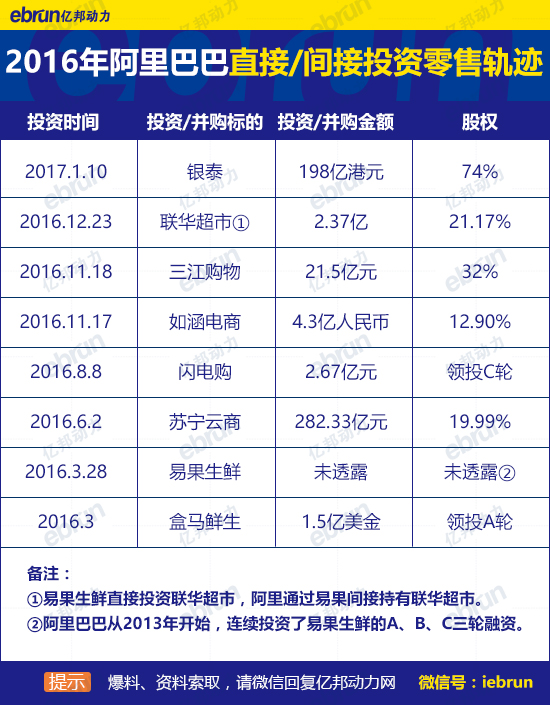百联是上海国资委背景,虽然这次协议没有资本运作,但早在去年年末,阿里系投资的易果生鲜通过接手永辉超市出售的2.37亿股联华超市(百联股份旗下超市)内资股股份,已经获取了联华超市21.17%的股份,成为联华超市二股东。