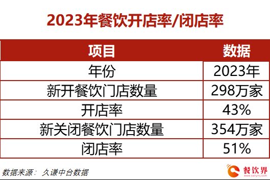 久谦中台数据显示,2023年,餐饮行业全年新关店数达到354万家,闭店率高达51%。高闭店率的背后,是餐饮业愈发明显的“存量竞争”。近两年高潮迭起的价格战、频频被爆闭店的高端餐饮,以及成为创业主流的亲民餐饮,也从侧面佐证了餐饮业的存量竞争。因为,在存量竞争时代,公众对餐饮的诉求更加趋于刚需,刚需属性则引领着餐饮经营更注重性价比。