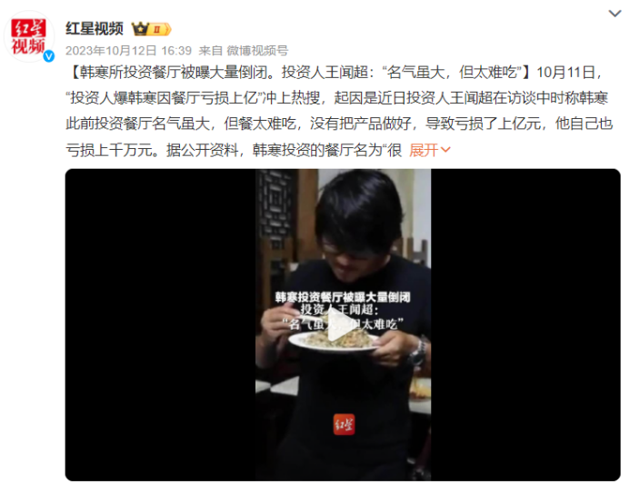 “很高兴遇见你”以直营方式扩张,高峰时期在全国开设了60多家门店。去年,#投资人爆韩寒因餐厅亏损上亿#的话题冲上热搜,投资人王闻超谈及“很高兴遇见欠”失败的核心原因表示:“本末倒置”,名气响,但餐品太难吃,到后期就算想改进食品也已无力挽救。他提到,因为投资“很高兴遇见你”,他亏损了近千万,而韩寒更是亏损了上亿元。