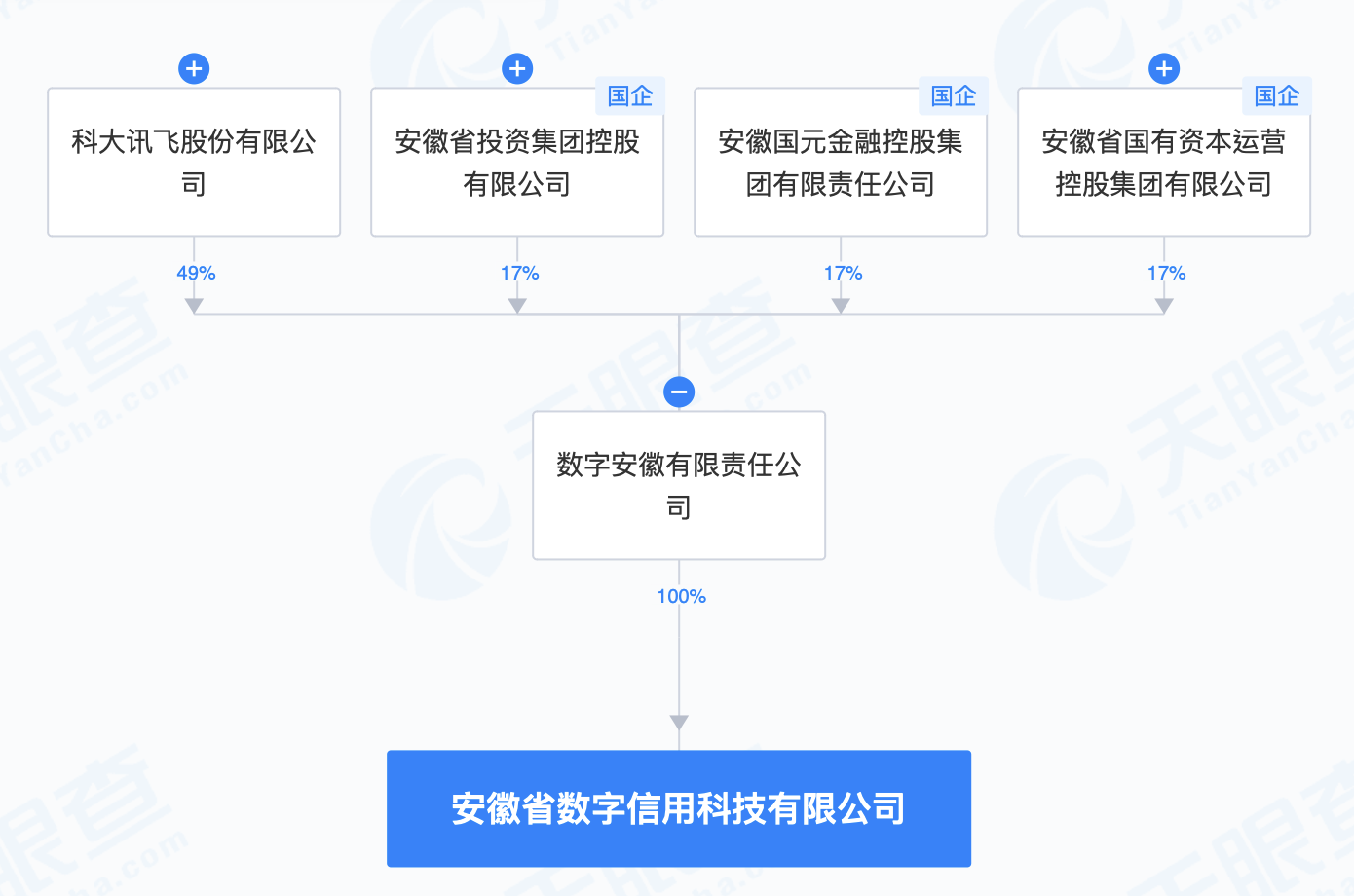 天眼查APP显示,近日,安徽省数字信用科技有限公司成立,注册资本1000万元,经营范围包含互联网信息服务;互联网安全服务;人工智能公共数据平台等。天眼查股权穿透显示,该公司由数字安徽有限责任公司全资持股,后者大股东为科大讯飞。