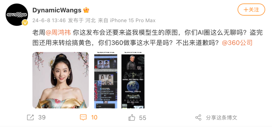发布会结束仅两天后,一名昵称为“DynamicWangs”的AI创作者发帖称周鸿祎在发布会使用的图片为盗用其模型生的原图。DynamicWangs向记者表示,该女性古装写真是通过重绘他创作的原图得到的,而原图是他使用其本人训练、调试的AI绘图模型生成的。