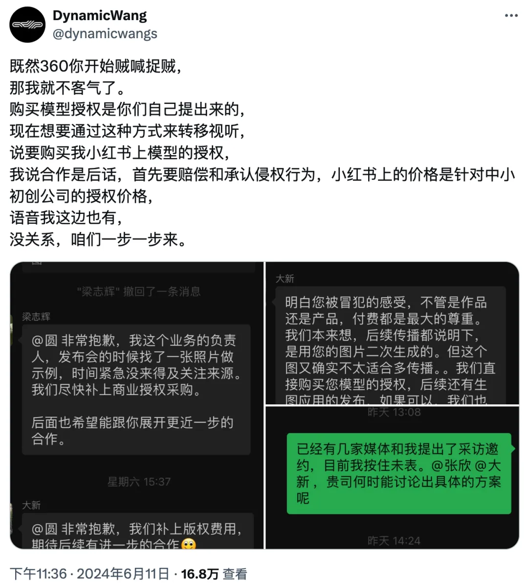 360副总裁梁志辉在回应AI盗图事件时曾“隔空问话”DynamicWangs:“你用来训练模型的图片都有版权吗?那么模型的版权归属,模型生图的版权归属,又如何界定呢?版权不开放,AIGC很难发展起来。新技术带来新问题,真理越辩越明,希望通过公正公开的讨论真正推动国内AIGC产业的发展进步。”