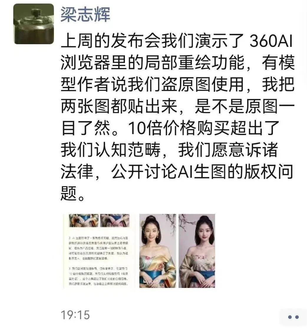 6月11日,360集团副总裁、360AI浏览器产品经理梁志辉针对360AI新品发布会盗图一事回应称,“上周的发布会我们演示了360AI浏览器里的局部重绘功能,有模型作者说我们盗原图使用,我把两张图都贴出来,是不是原图一目了然。10倍价格购买超出了我们认知范畴,我们愿意诉诸法律,公开讨论AI生图的版权问题。”