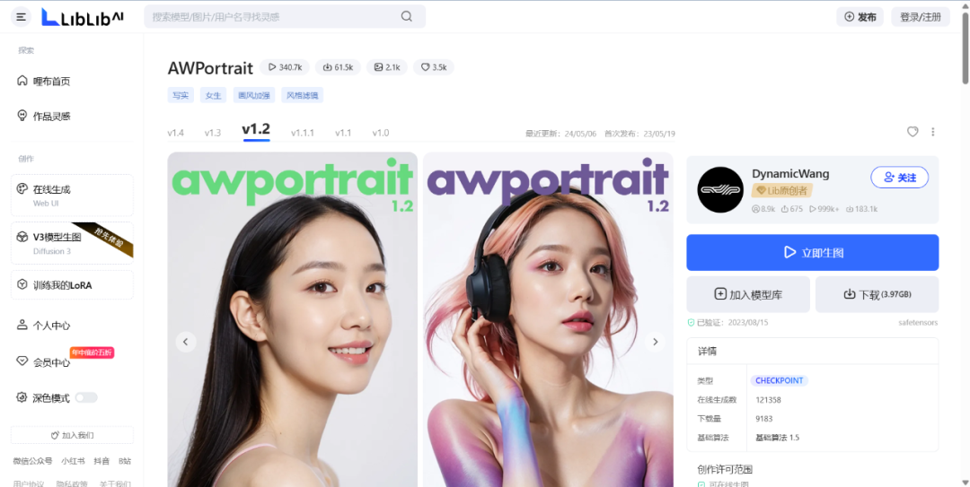 元宇宙新声了解到,生成前述图片的模型为AWPortrait1.2,由DW发布在国内AI创作平台LiblibiAI,目前已更新到1.4版本,共有超18万次的下载量。关于模型使用协议,DynamicWangs在模型介绍页写到,企业用户如需使用本模型,均需购买本模型的商业授权。
