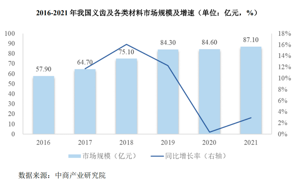 近年来,受益于人们经济生活、文化消费水平的提高以及对口腔健康意识的增强,我国义齿及各类材料市场规模呈现不断增长的趋势。根据中商产业研究院预测,2021年,我国义齿及义齿材料市场规模达到87.1亿元。