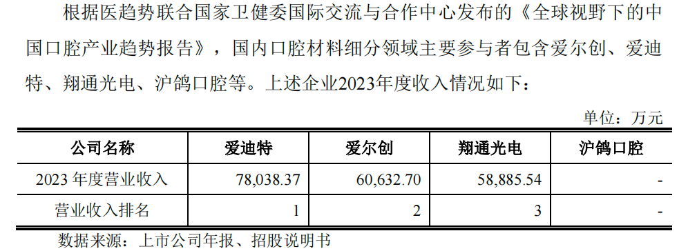 在国内口腔材料细分领域主要参与者中,2023年,爱迪特以7.8亿元的营业收入排在第一位。