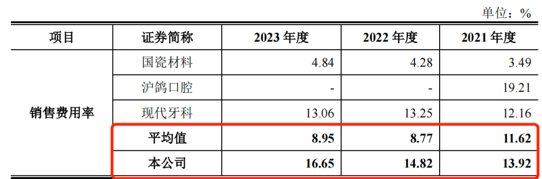 报告期内,同行可比公司销售费用率平均值分别为11.62%、8.77%和8.95%,远低于爱迪特销售费用率水平。