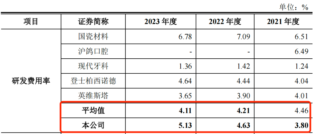 同期,同行可比公司的研发费用率均值分别为4.46%、4.21%和4.11%。其中,2022年和2023年,爱迪特的研发费用率略高于同行可比公司。