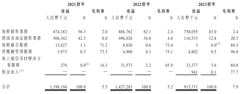 近年来,海上鲜收益主要来源于海鲜销售、燃油及油品销售、海鲜撮合服务、供应链管理服务、海上通信及IT解决方案及租金收入。2023年,该公司83%收入来自海鲜销售业务。