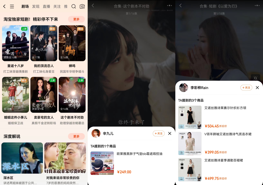 在最新版的手淘 App 下列“视频” — “剧场”板块,已经可以看到淘宝的独家短剧专栏,截至发稿日专栏展示了 17 部短剧,已完结的剧集集数多在 20 以内,且免费观看。点进单集浏览有概率看到右下角出现商品链接,点击直接跳转至平台商品展示页。