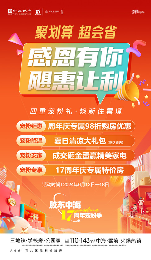 更为令人心动的是,今年恰逢中海胶东公司成立17周年,为此,中海·雲境特别推出周年庆活动:6.12-6.18活动期间,凡购买中海·雲境任一户型的购房者,均可享受高达98折的专属优惠;复访客户还将获得精心准备的夏日清凉大礼包,在炎热的夏日感受到中海·雲境的清凉与关怀;成功购房的业主还有机会参与砸金蛋活动,赢取精美家电大奖;此外,项目还特别推出了17周年庆专属特价房,如此诚意不仅是中海·雲境对购房者的一种深情回馈,更是对其卓越品质与一流服务的肯定。