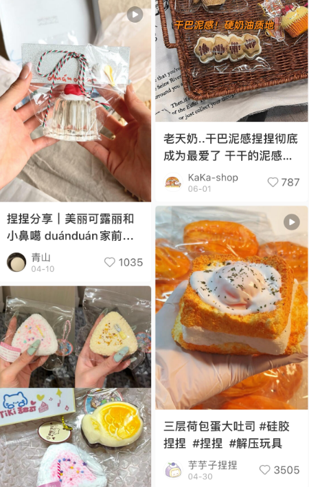 2023年开始,捏捏从社交平台兴起并快速火遍网络。在抖音平台上,#捏捏#话题播放量超过11.5亿,相关的#捏捏乐#、#硅胶捏捏#、#自制捏捏#等话题播放量也都过亿,“陈胖的快乐日记”是分享做手工日常的博主,做捏捏是她视频的主要内容,目前她在抖音平台已经拥有42.5万粉丝,视频点赞量平均都会突破2万;在小红书平台上,#捏捏#话题浏览超过21亿次,蓝莓捏捏、咸蛋黄饭团捏捏、吐司捏捏、荔枝捏捏都是小红书上的爆款,每个售卖链接上都显示着过千的销量。