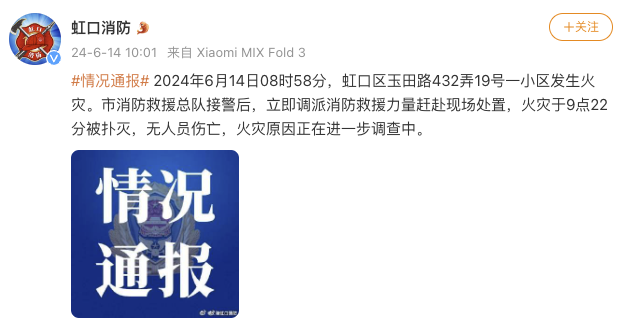 @虹口消防 消息,6月14日08时58分,虹口区玉田路432弄19号一小区发生火灾。市消防救援总队接警后,立即调派消防救援力量赶赴现场处置,火灾于9点22分被扑灭,无人员伤亡,火灾原因正在进一步调查中。