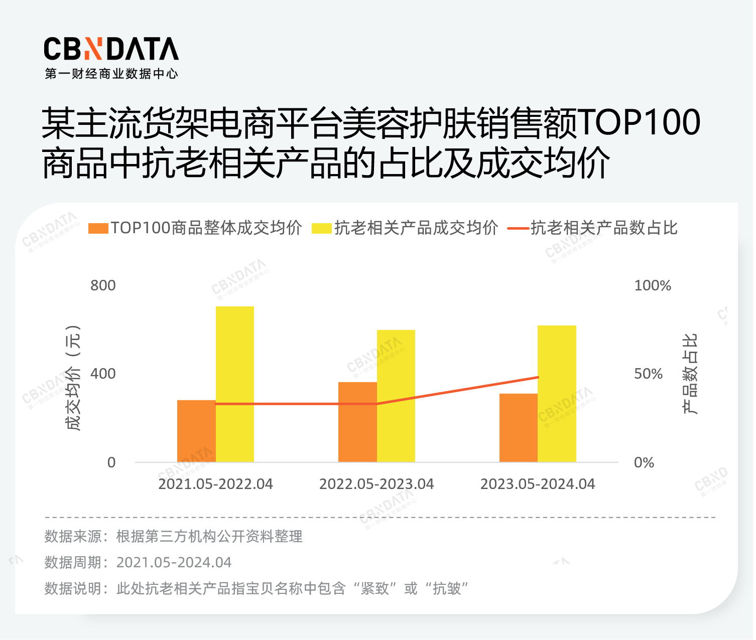 尽管类似的争议不断,但抗衰老美妆依旧“能打”,主打此类功效的产品往往能够卖出高价。根据第三方机构公开资料显示,2023年5月-2024年4月某主流货架电商平台美容护肤品类销售额最高的100件商品中,48件的名称中包含“抗皱”或“紧致”,其成交均价约为TOP100商品整体成交均价的2倍。