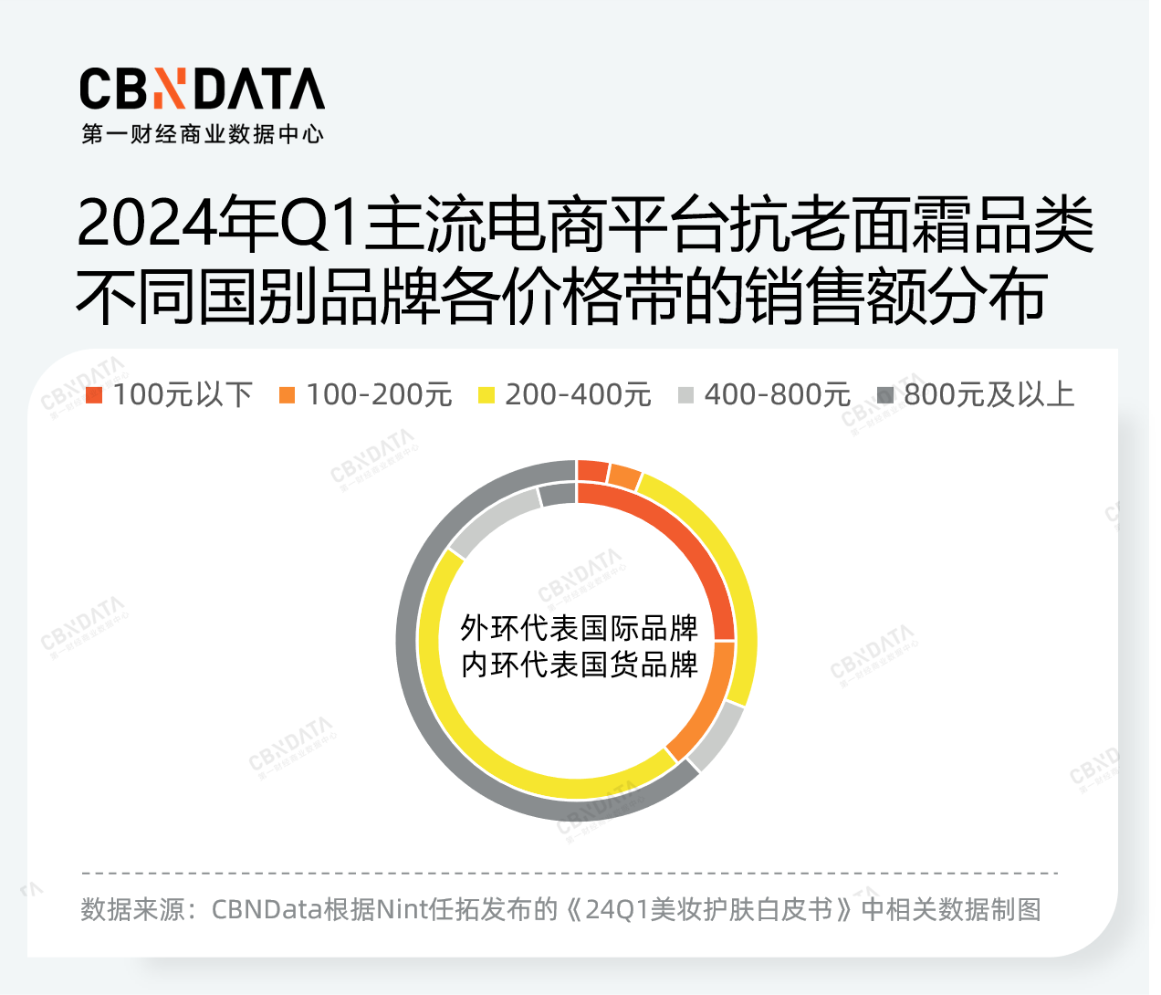 与自身纵向对比来看,大多数国货品牌的抗衰单品或产品线在其单品中已经处于相对高端的价格带。部分定位于“专研抗老”的国货品牌,其品牌定位也明显试图摆脱国货的平价形象,从一开始就避开低价路线。从这个角度来说,发力强功效、推抗老产品已经帮助国货品牌在中高端市场拥有了一席之地。以抗老面霜为例,根据Nint任拓发布的《24Q1美妆护肤白皮书》,2024年Q1国货品牌800元以上价格带的销售额同比增长116%,已经开始在国际大牌的优势地盘分一杯羹。