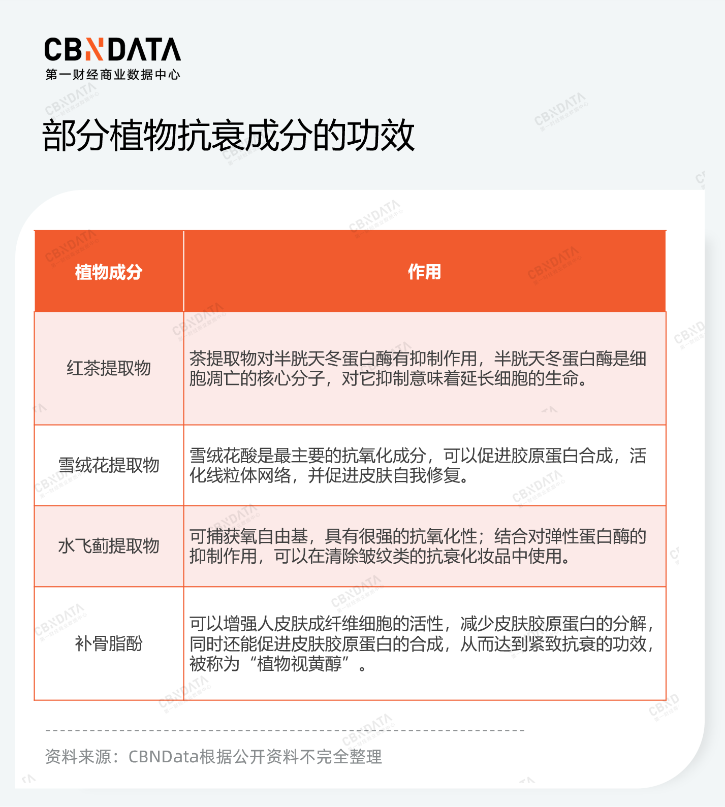 除此之外,红茶、雪绒花、山茶花等消费者熟知的天然植物,也广泛被应用于抗衰老护肤领域。不同植物成分对于抗衰老有着不同的作用机制与具体功效,为品牌提供了差异化的切入方向。