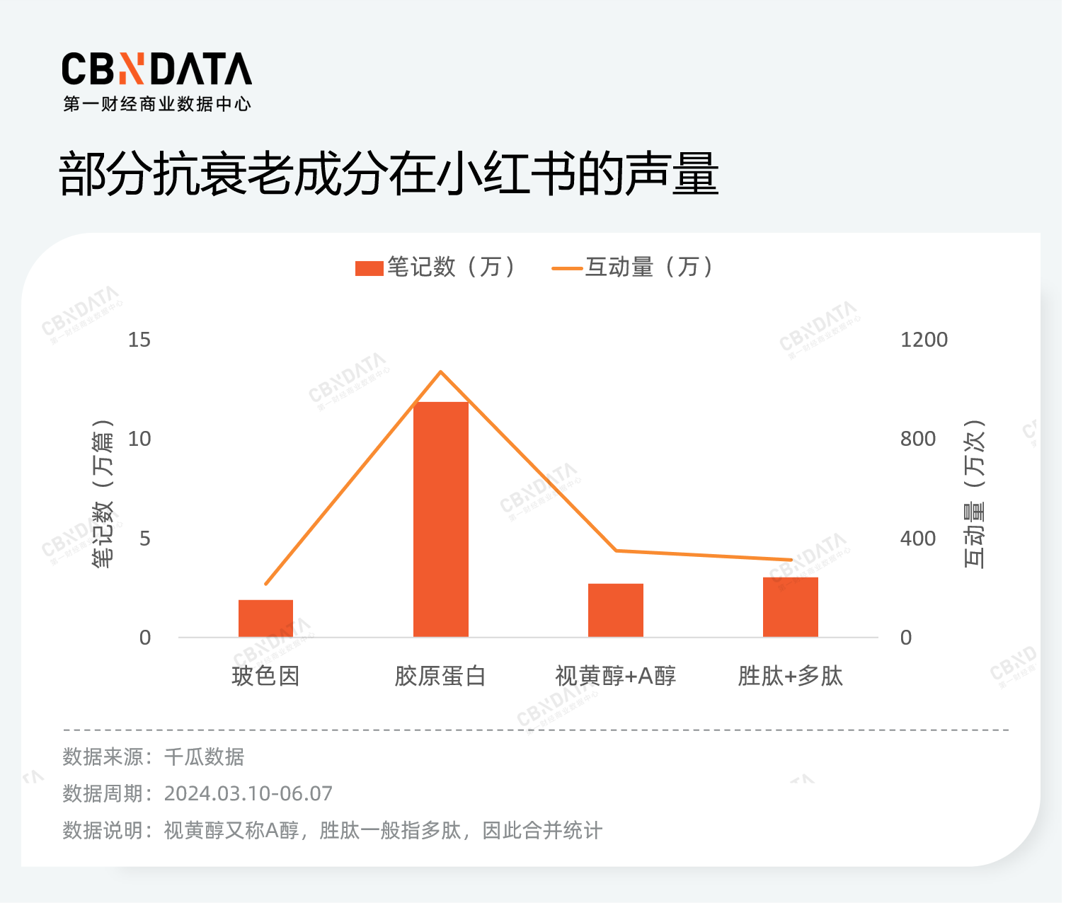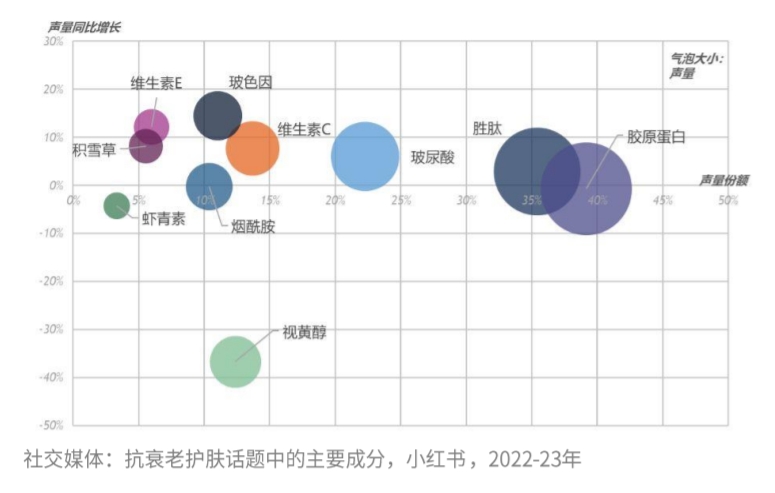 折射到抗衰老市场,战火之烈首先体现在成分与原料的迭代。得益于早期“成分党”的流行、相关品牌的推动,胶原蛋白、玻色因、视黄醇(A醇)、胜肽等抗衰老成分在消费市场得到普及。此类明星成分对品牌来说也存在两面性,好的因素在于其研发与供应较为成熟,品牌推出相关产品时无须再进行科普,但同时意味着品牌面临更加激烈的竞争、抢占市场份额的难度更高。以玻色因为例,欧莱雅专利到期后,国内市场上涌现出众多主打玻色因的产品。据用户说发布的《2024年中国流行成分和原料消费趋势洞察》,2022年12月至2023年11月期间,该成分备案数同比增长89.34%。在这样的现状下,品牌需要在成分的表象之下,找到能够打动消费者的新解法。