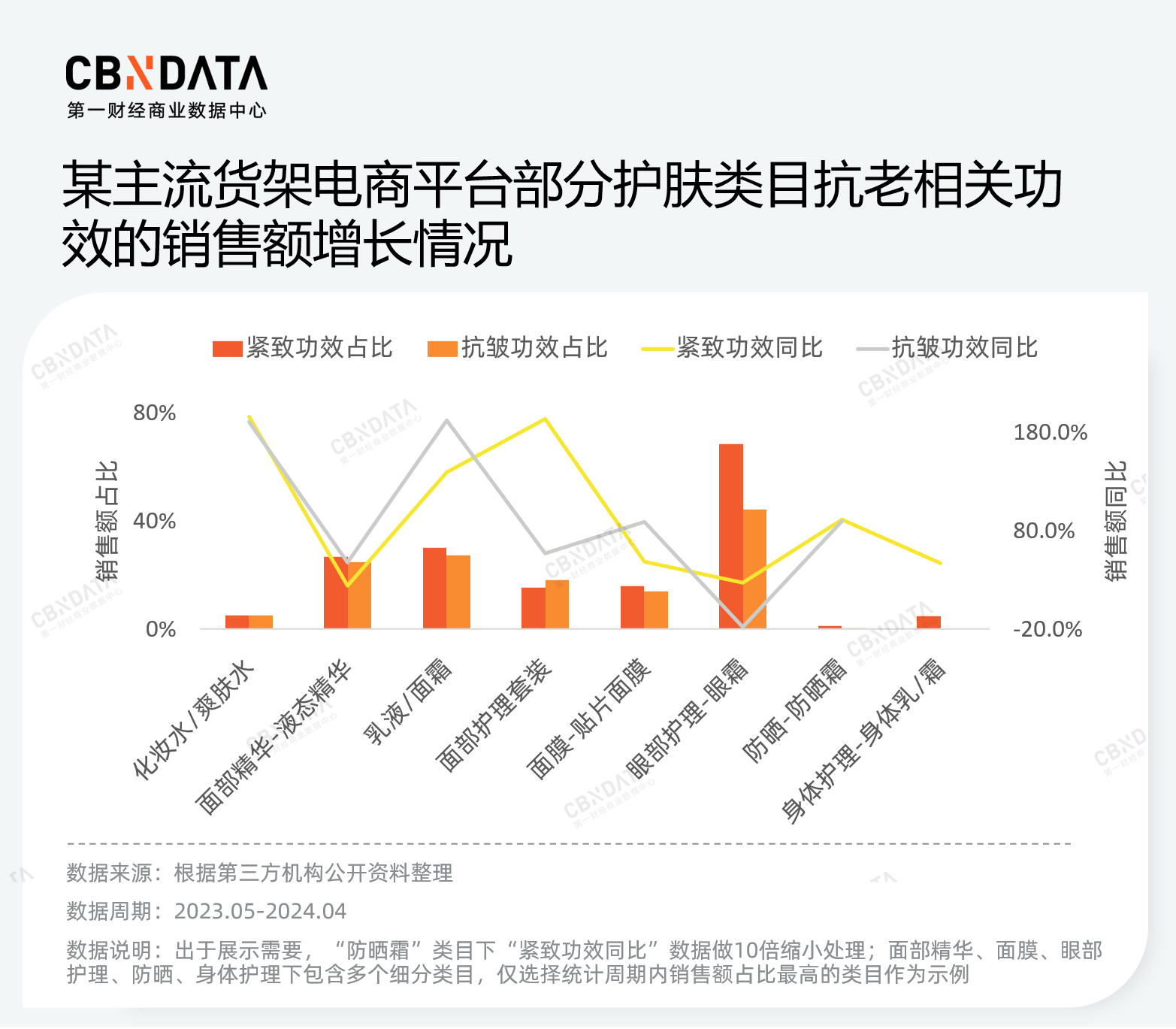 电商侧数据也印证了抗衰老功效在不同护肤品类内的增长趋势。第三方机构公开资料显示,过去一年某主流货架电商平台内,从化妆水、精华、乳液与面霜、面膜到防晒、身体护理,抗老相关功效的占比呈现上升态势。