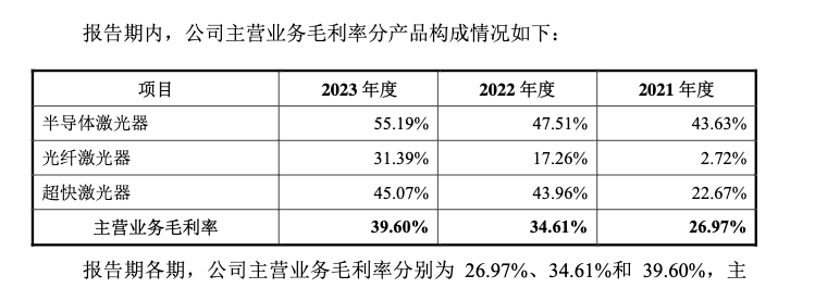 根据招股书,2021年至2023年,凯普林光纤激光器毛利率分别为2.72%、17.26%、31.39%,同期,公司半导体激光器毛利率分别为43.63%、47.51%、55.19%,主营业务毛利率分别为26.97%、34.61%、39.60%。