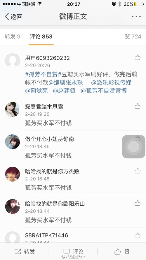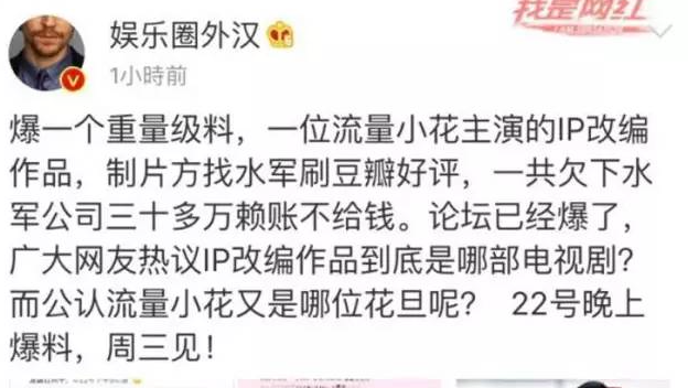 同时,“娱乐圈揭秘”、“娱乐圈外汉”等微博营销号也爆料称“某IP改编作品找水军刷豆瓣好评,一共欠下水军三十多万赖账不给钱”。疑似矛头指向深陷水军讨薪风波的《孤芳不自赏》。