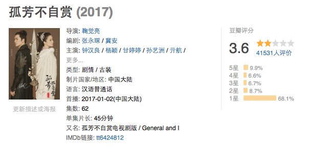 目前,《孤芳不自赏》的豆瓣评分从开播时的7.8分跌至如今的3.6分,有68%的用户打出了1星评价。