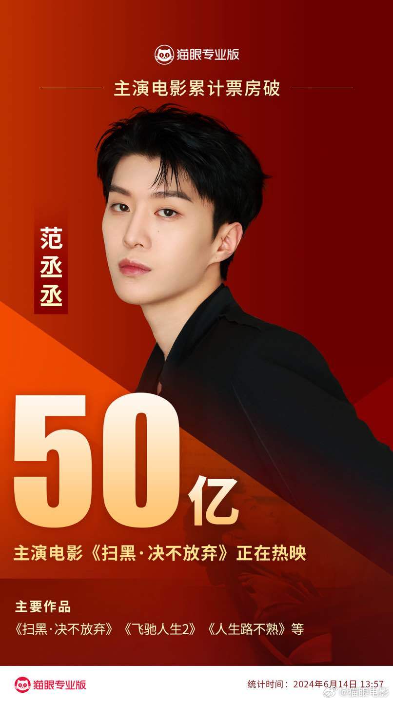 6月14日,据猫眼专业版数据,范丞丞主演电影《扫黑·决不放弃》正在上映,其主演电影累计票房突破50亿元。