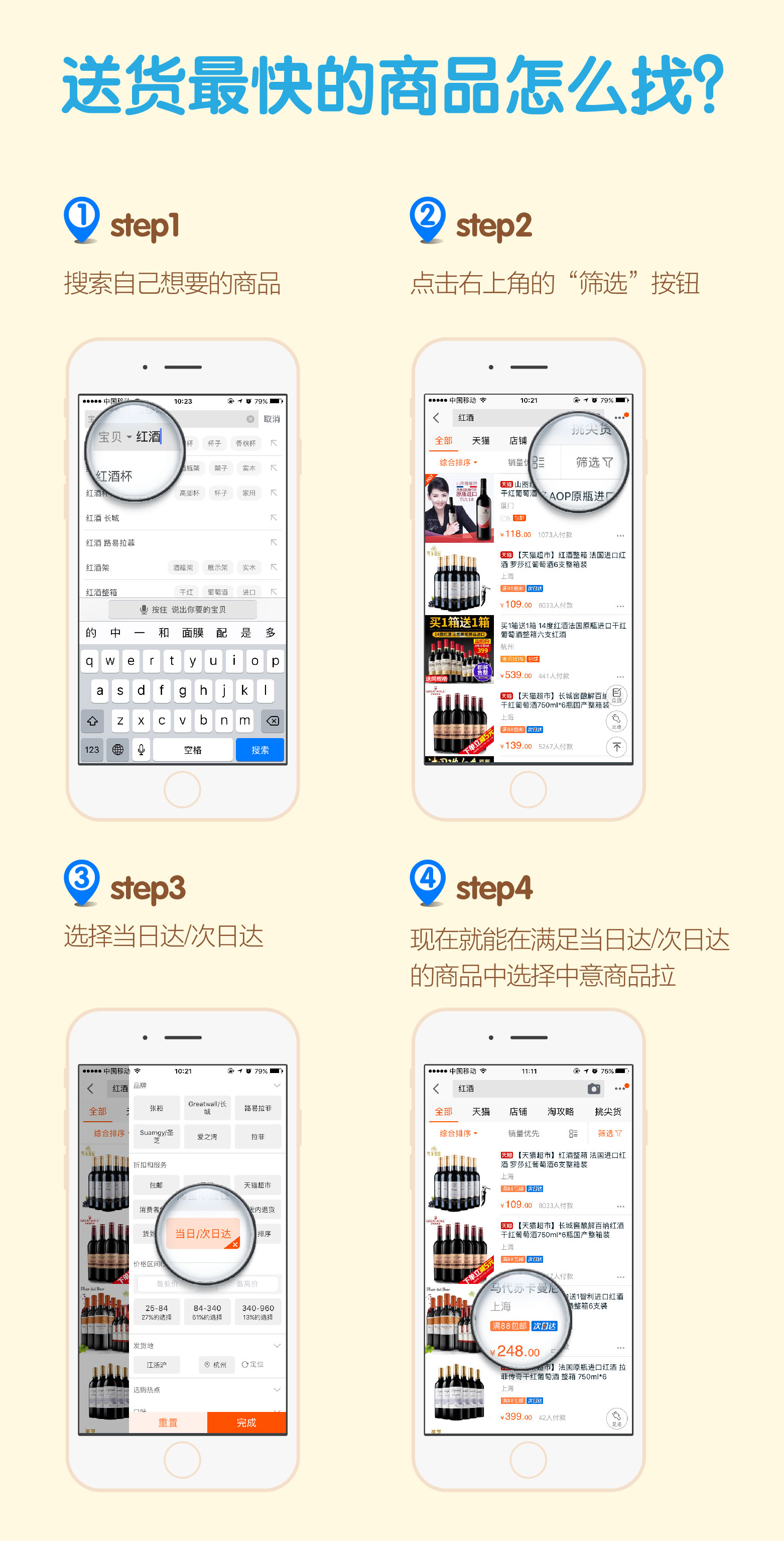 买家只需要登录“手机淘宝客户端”、“天猫手机客户端”和“淘宝PC端”,在搜索框里输入想买的商品关键词后,大数据算法会根据时间、默认收货地址和商品等信息,在搜索结果中呈现带有“当日达”和“次日达”标识的商品。